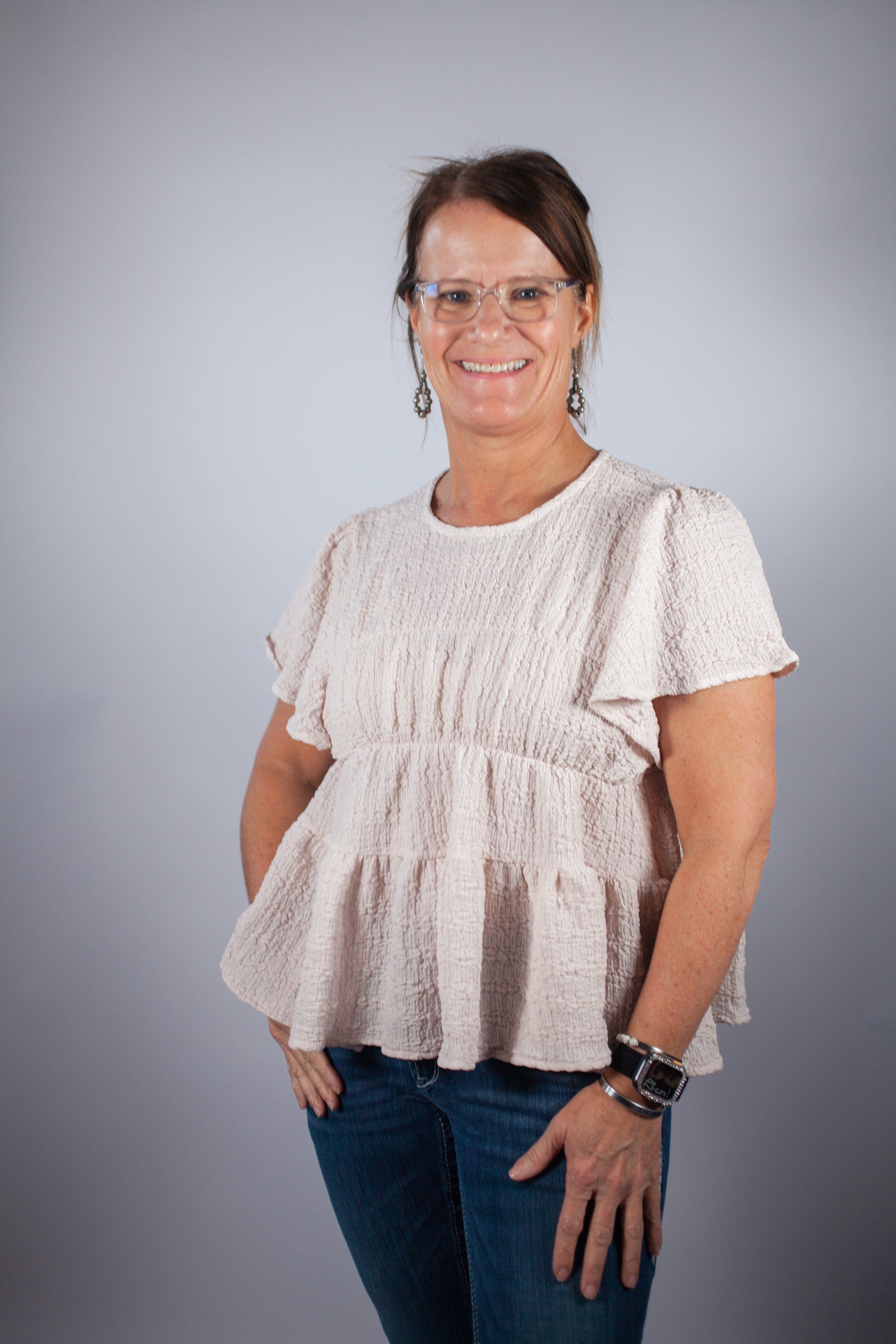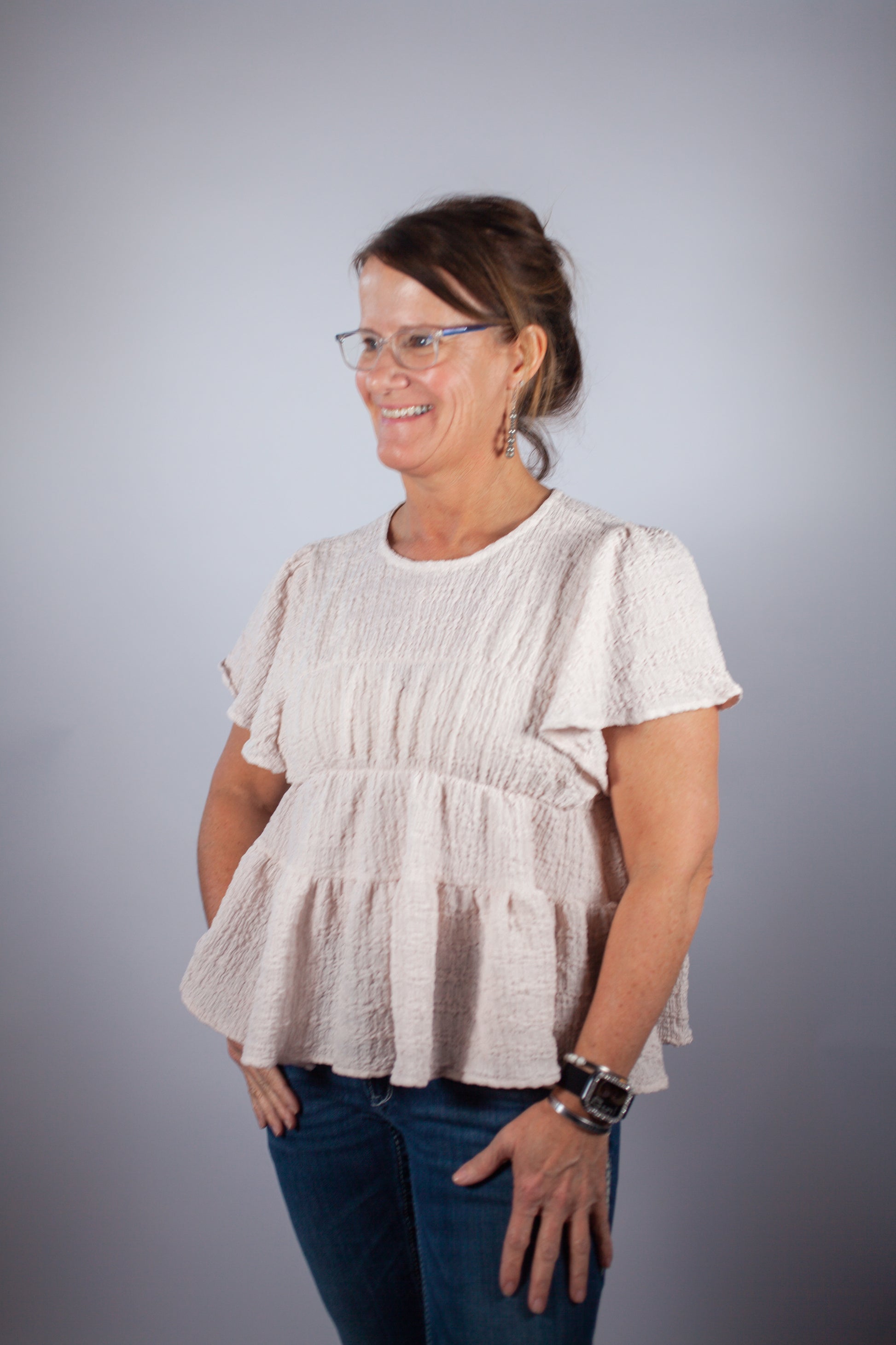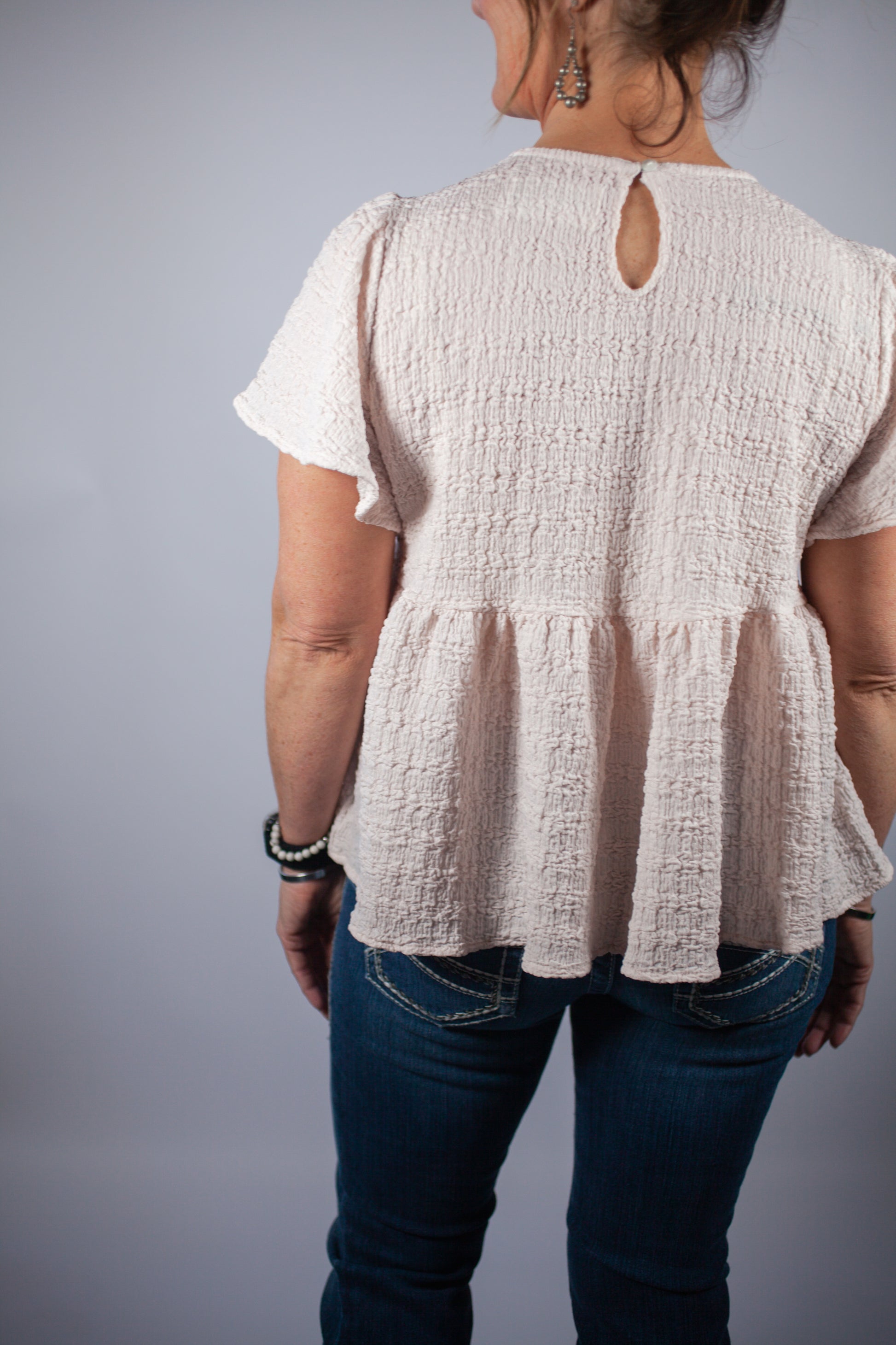 Cream ruffle tiered textured top, crew neck, short sleeve, keyhole detail at the back! Perfect top for an effortless dressed up look!